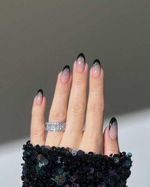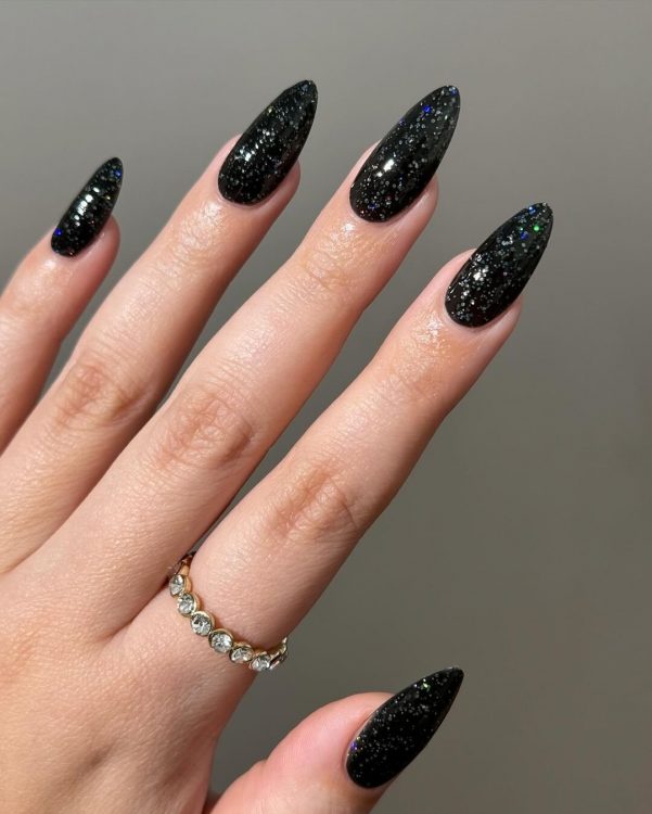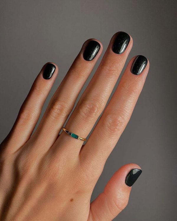 Щоб освіжити таке покриття, варто придивитися до чорного манікюру з глітером. Підійде як топ із ледь помітними блискітками, так і лак з великими світловідбиваючими частинками.