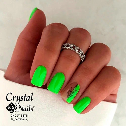 Якщо ви є володаркою коротких нігтів і мрієте про неоново-зелений манікюр, цей варіант точно вам підійде. Розбавте однотонне покриття акцентом у вигляді елегантної чорної гілочки.