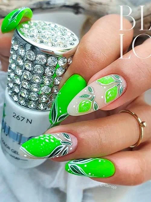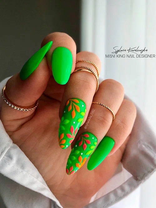 Неоново-зелені нігті, безперечно, є справжнім хітом у світі нейл-арту. Щоб зробити їх ще більш оригінальними можна додати трохи яскравого декору у вигляді кольорового листя.
