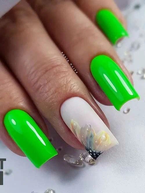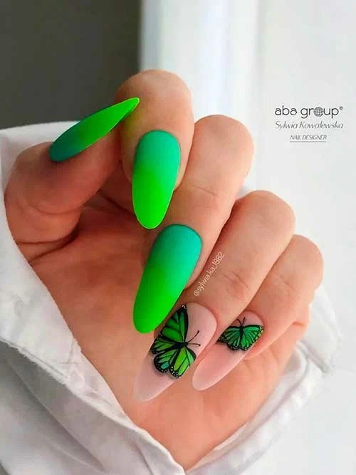 Завдяки неоново-зеленому омбре ви зможете створити яскравий образ, не жертвуючи елегантністю натуральних нігтів. Існує безліч варіантів дизайну у цій популярній техніці. Для літа ідеально підійдуть ніжні метелики на двох акцентних нігтях.