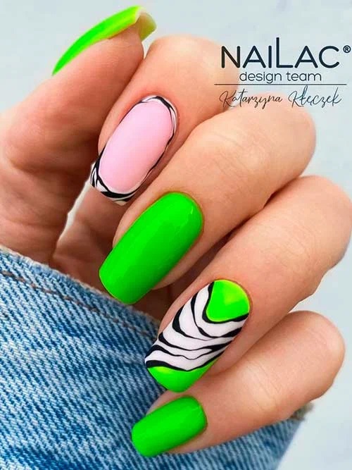 Якщо ви хочете оживити свій модний образ, то чому б не спробувати зробити неоново-зелений манікюр з принтом під зебру в яскравих тонах. Такий дизайн чудово підійде до будь-якого літнього вбрання.