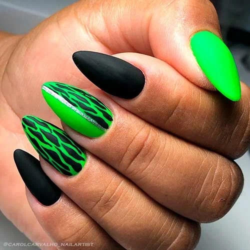 Якщо ви хочете виглядати модно та сучасно, обов’язково спробуйте використати в нейл-арті поєднання чорного та неоново-зеленого. Літо – найкращий для цього час. Матовий фініш надасть нігтям дорогого та розкішного вигляду.
