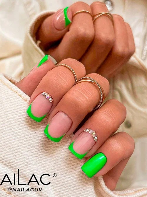 Якщо ви втомилися від класичного французького манікюру, спробуйте замінити традиційний білий колір на неоново-зелений. Це максимально простий у виконанні дизайн, який можна зробити лише у два етапи. Виберіть базове покриття тілесного кольору, а потім тонким пензликом намалюйте яскраві кінчики.