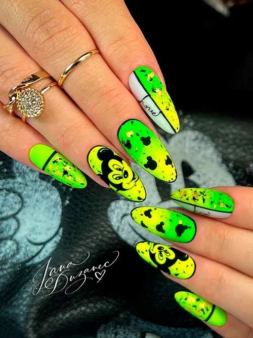 Персонажі мультфільмів на тлі жовто-зеленого омбре – це кумедний та життєрадісний дизайн, який напевно підніме вам настрій. Ви обов’язково отримаєте багато компліментів.