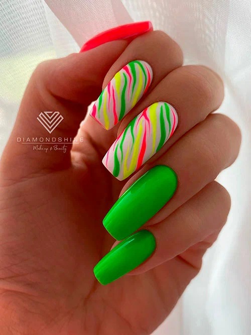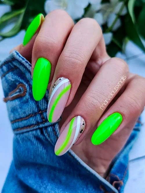 Для отримання максимально насиченого неоново-зеленого манікюру спробуйте додати контрастні світлі кольори. Нафарбуйте два акцентні нігті напівпрозорим лаком і намалюйте абстрактні лінії білого і зеленого кольору. Додайте трохи блискіток.