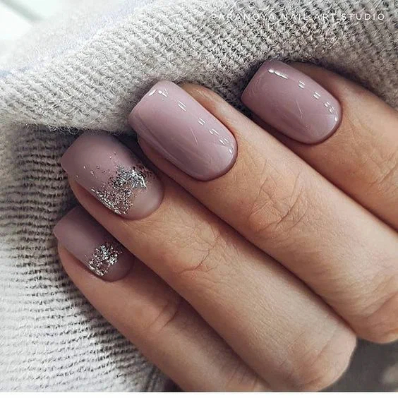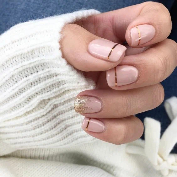 Щоб нейтральний нюд виглядав модно і незвичайно, на його тлі можна розташувати трохи стразів і блискіток. За допомогою блискіток на одному з нігтів можна зробити гарний градієнт.
