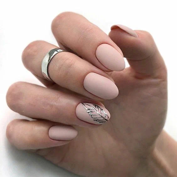Для наступного модного дизайну нейл-майстри використовували нюдове покриття + матовий топ. На цьому нейтральному тлі розкішно виглядає тропічний принт срібного кольору.