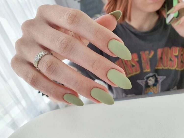 Альтернативним варіантом однотонного глянцевого манікюру буде матовий дизайн нігтів у ніжній пастельно-зеленій кольоровій гамі.