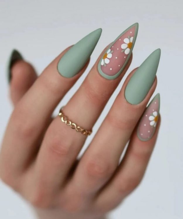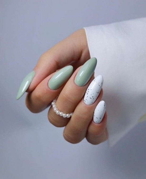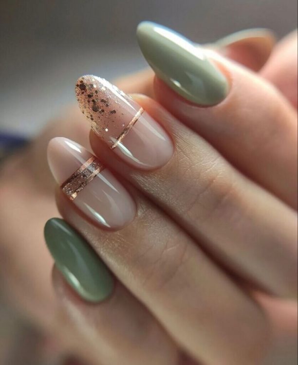 Зелені відтінки добре виглядають з бежевими, пастельно-рожевими та білими тонами – такий нейл-арт завжди виглядає стильно, але при цьому не викликає відрази навіть під час довгого носіння.