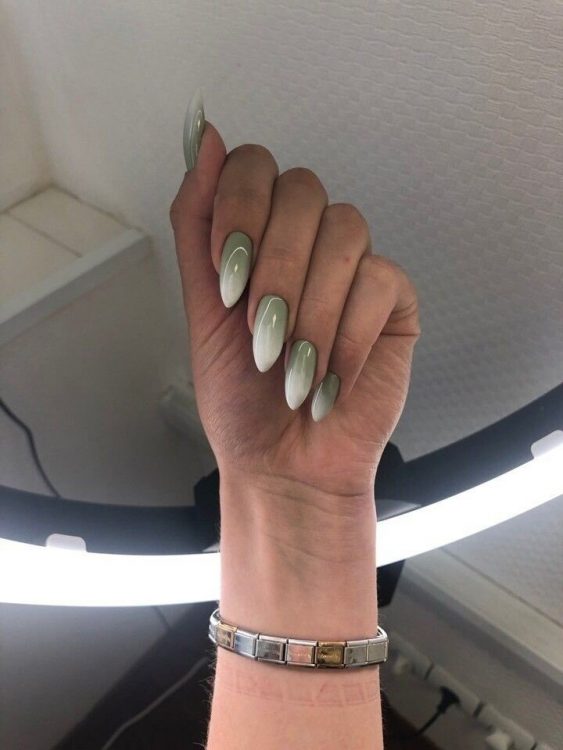 М’який градієнт з переходом із ніжного зеленого в молочно-білий колір – це найкращий вибір для любительок зеленого кольору та мінімалістичного дизайну нігтів.
