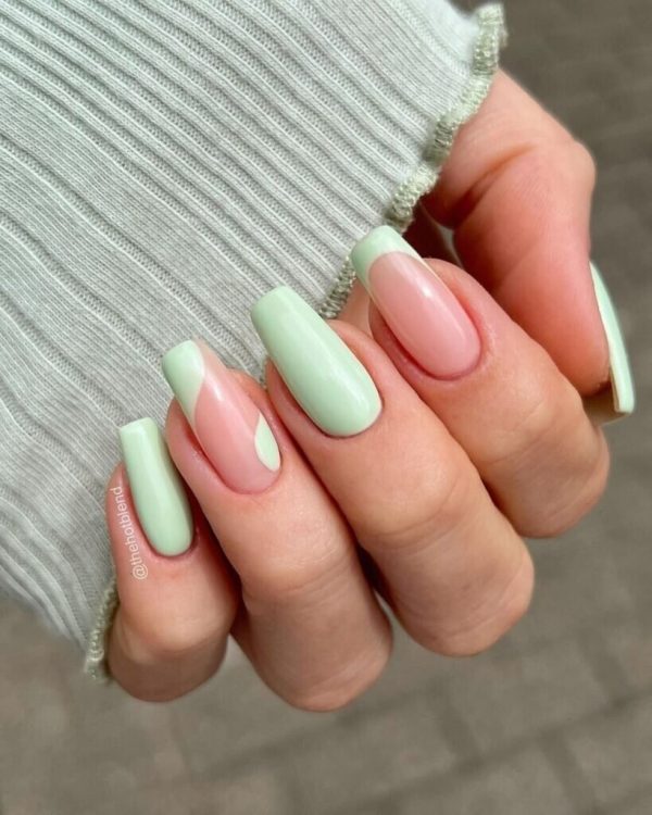 Ніжні пастельні тони зеленого кольору можна використовувати для створення французького манікюру, при цьому можна сміливо комбінувати звичний однотон із френчем у будь-якій послідовності.