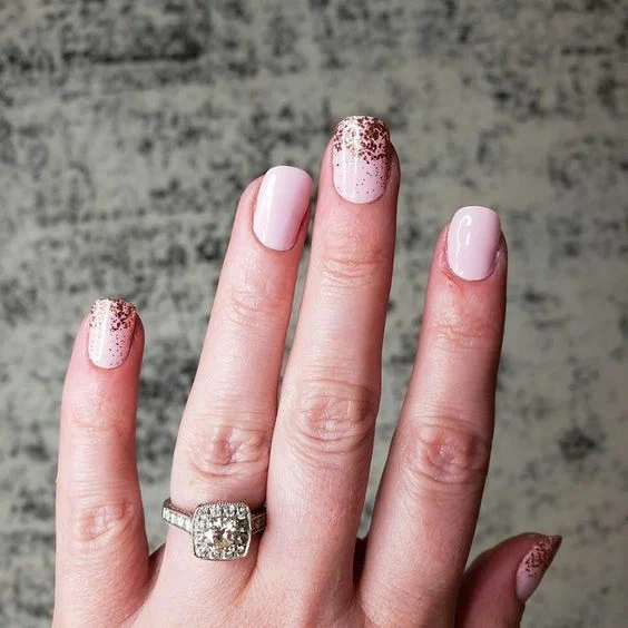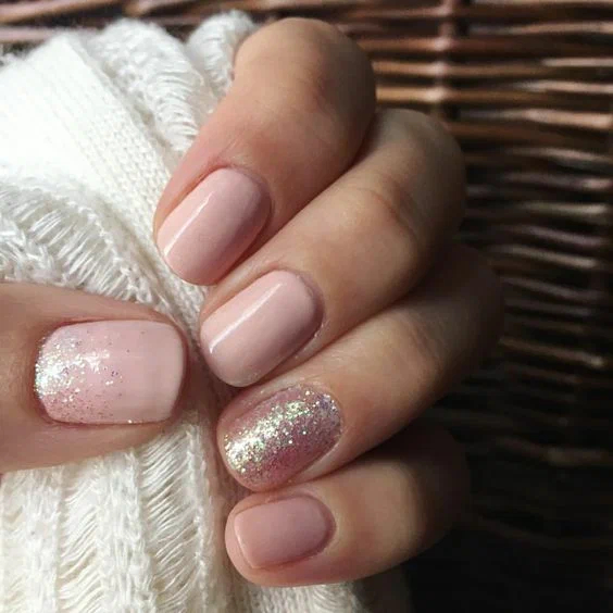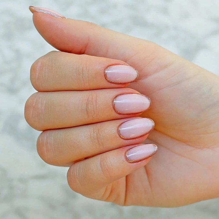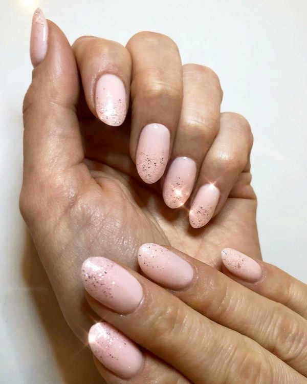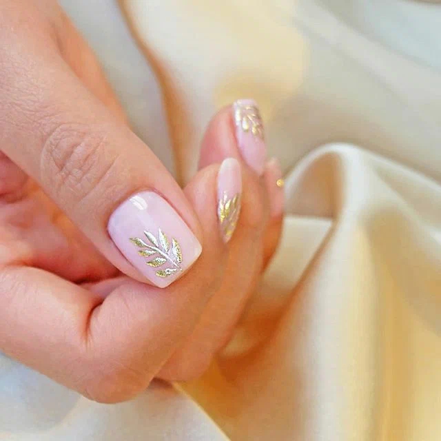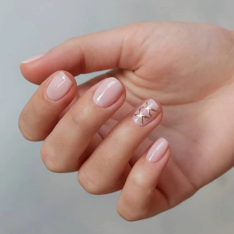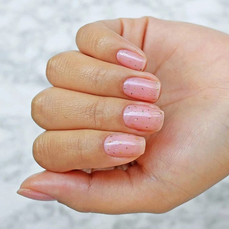 Нейтральний нюдово-рожевий однотон виглядатиме незвичайно та ефектно, якщо його доповнити золотою дрібною поталлю. Розсип ніжних золотих відблисків зробить манікюр незабутнім і привабливим.