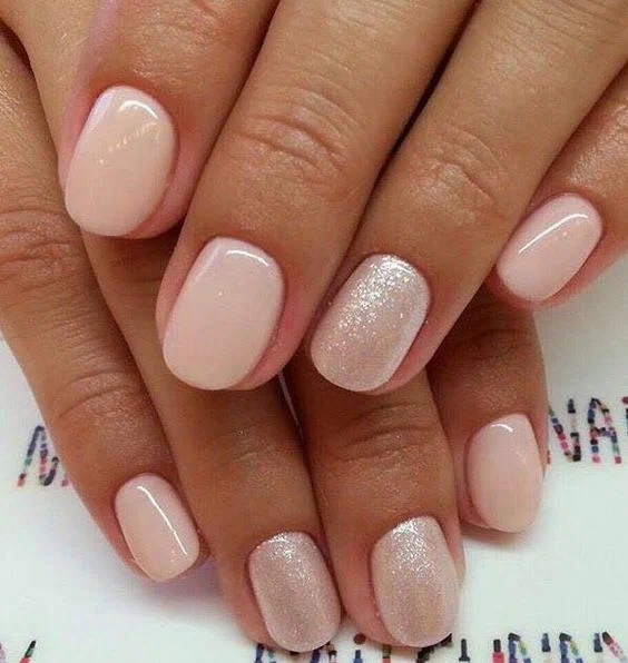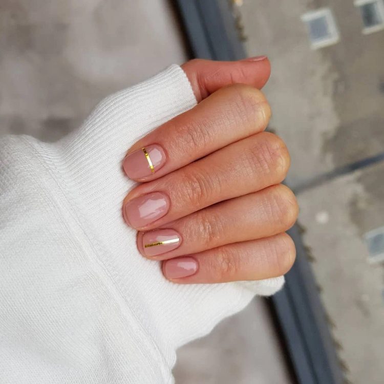 Молочно-рожеве однотонне покриття можна урізноманітнити за допомогою перламутрово-золотих акцентів. Щоб манікюр заграв новими фарбами, достатньо лише кілька нігтів нафарбувати золотим лаком, залишивши всі інші в нейтральному пастельно-рожевому кольорі.