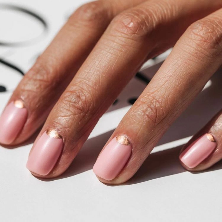 Наступний модний «місячний» дизайн на рожевому фоні нейл-майстри виконали із золотим акцентом.