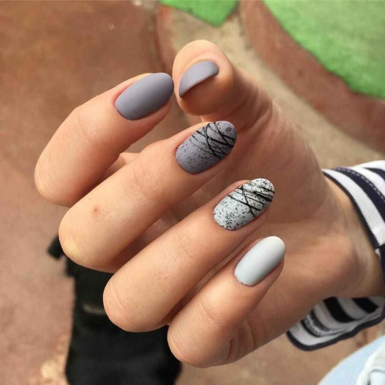 Дизайн нігтів у сірих відтінках добре виглядає з павутинкою – спеціальним лаком, який наносять поверх основного кольору в потрібних напрямках.