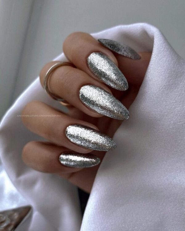 Найстильніший і найефектніший новорічний дизайн нігтів – це, звичайно ж, дизайн із сріблястим блискучим лаком без додавання інших відтінків.