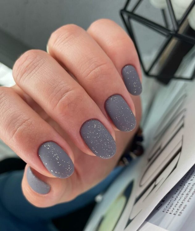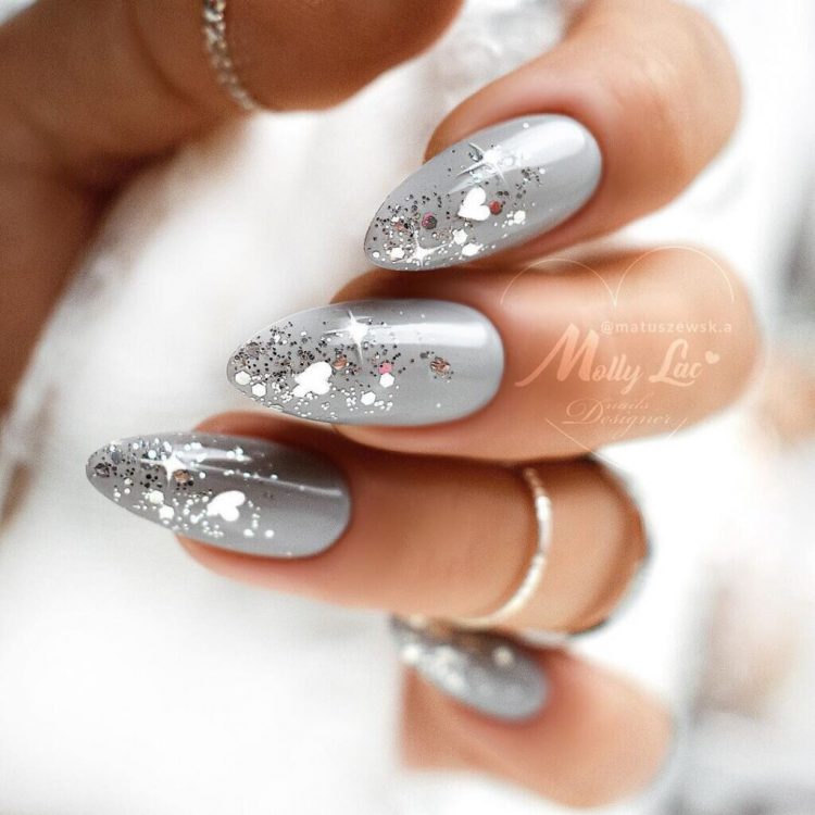 Сірі відтінки чудово гармонують із сріблястим лаком/блискітками, тому такий варіант можна сміливо взяти на озброєння для зустрічі нового року.