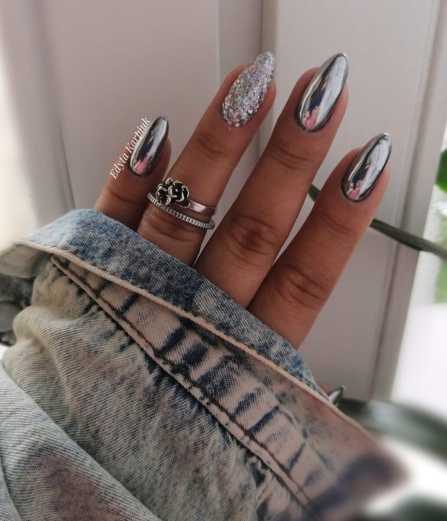 Дзеркальне втирання, мабуть, не можна назвати повсякденним варіантом дизайну нігтів, але через новорічні свята, що наближаються, можна сміливо вибрати і такий нейл-арт.