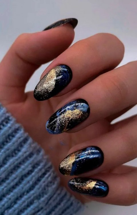 Темний, мармуровий манікюр із золотою фольгою на овальних нігтях