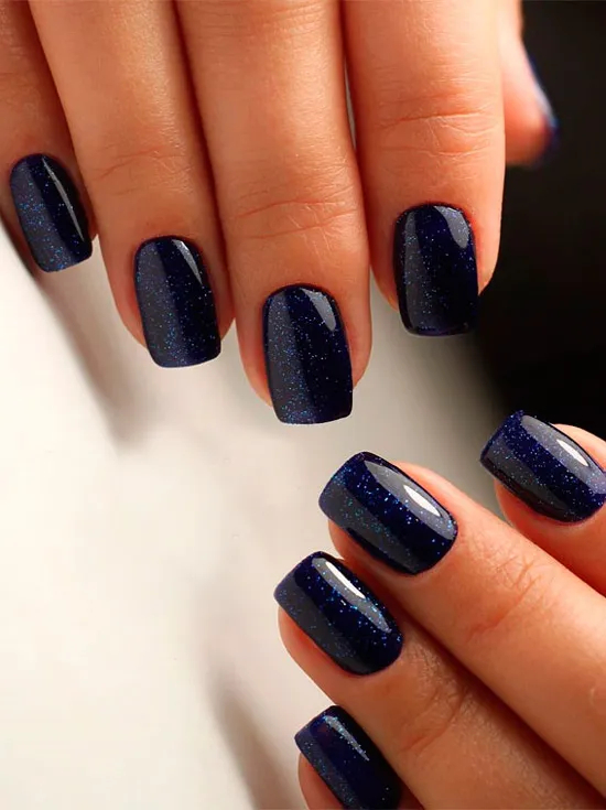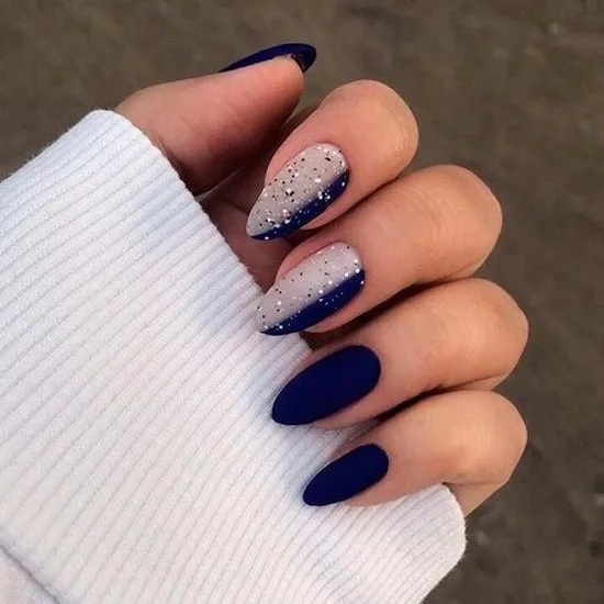Темно синій, матовий манікюр з блискітками на мигдальних нігтях