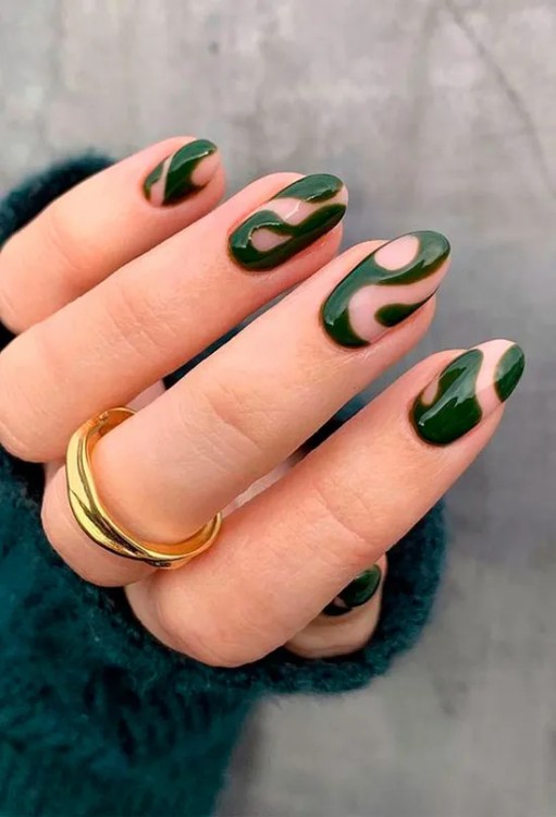 Темно-зелений манікюр з візерунками на доглянутих нігтях
