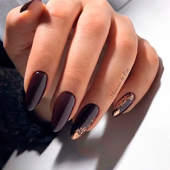 Темно бордовий манікюр із золотою фольгою на мигдальних нігтях