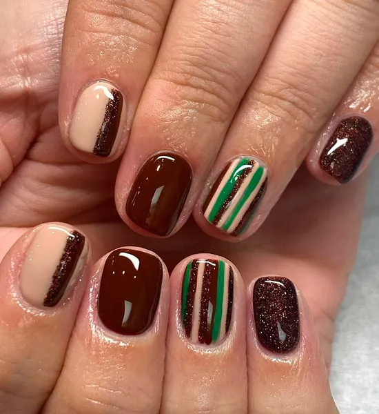 Коричневий манікюр у смужку з блискітками на коротких, натуральних нігтях