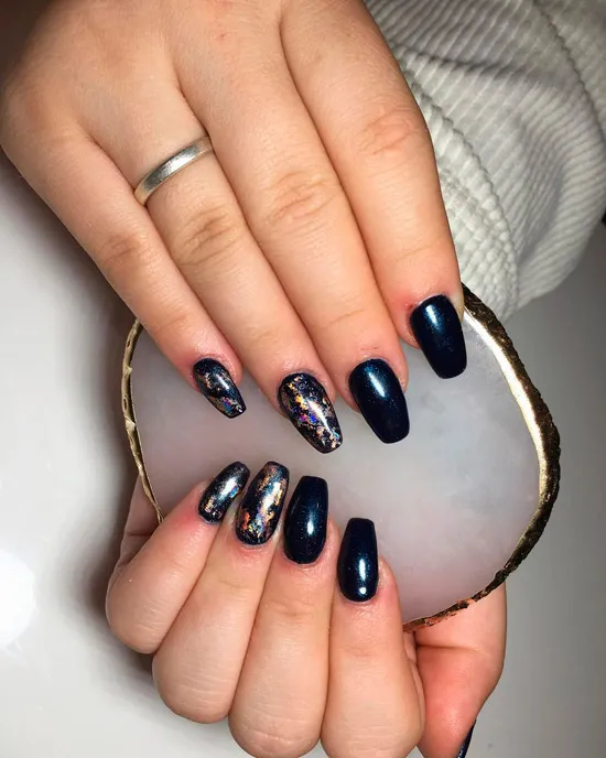 Темно синій манікюр з фольгою на квадратних нігтях