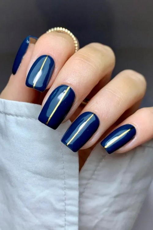 Темно синій манікюр із золотою лінією на квадратних нігтях