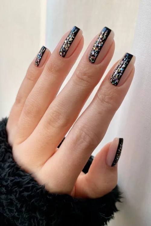 Чорний манікюр із блискітками на нігтях середньої довжини