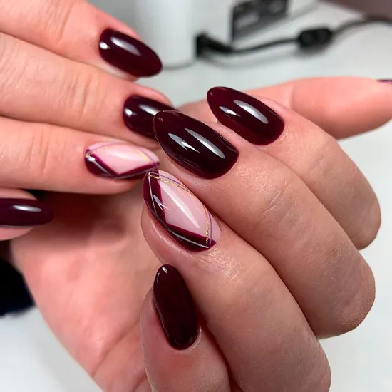 Бордовий манікюр із геометричними лініями на овальних нігтях