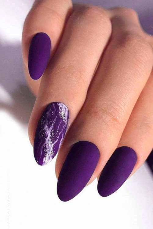 Темно-фіолетовий матовий манікюр з мармуровим ефектом на овальних нігтях