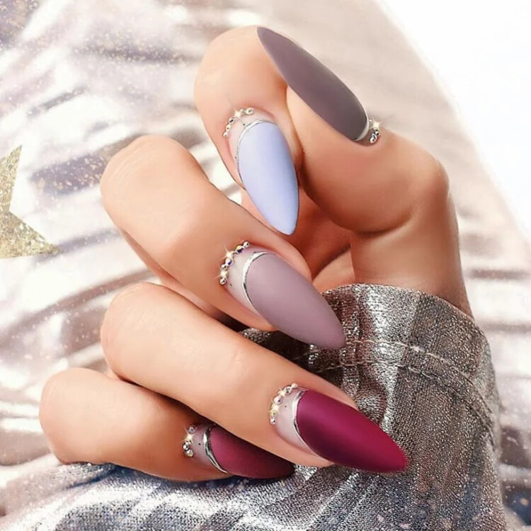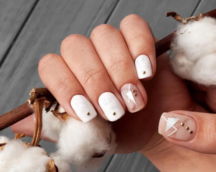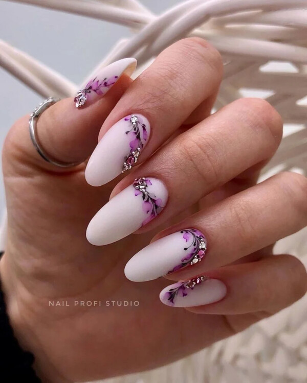 Навесні матовий манікюр можна сміливо комбінувати з малюнками, стразами і різноманітними глянцевими деталями.