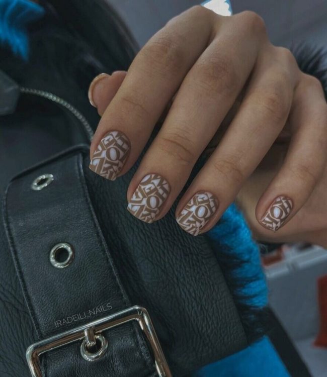 Цікаво виглядає дизайн нігтів із будь-якими літерами, розташованими як у хаотичному, так і в необхідному для прочитання слів порядку. У будь-якому випадку, літери надають дизайну особливого шику.