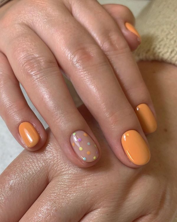 Рішення для тих, хто не готовий відмовлятися від однотонного покриття – зробити дизайн лише на одному нігті. Це можуть бути абстрактні лінії, цятки, малюнки.