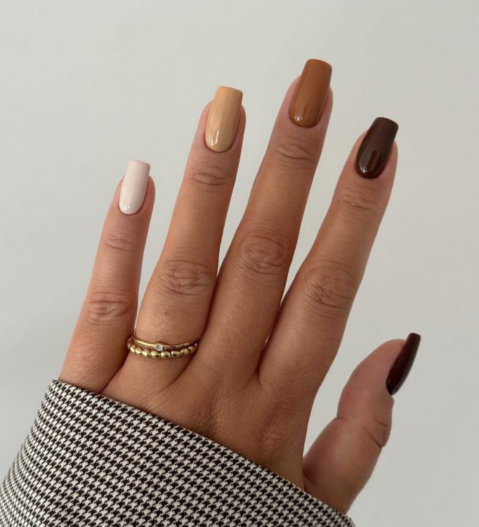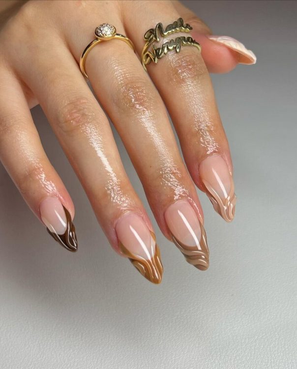 Не варто боятися поєднання яскравих відтінків і камуфлюючої бази на одному нігті. Їх здатна поділити чітка межа: пряма лінія чи дуга. Таким чином можна об’єднати два насичені кольори. Але важливо стежити, щоб вони поєднувалися один з одним. Наприклад, шоколадний доповнювати карамельним.