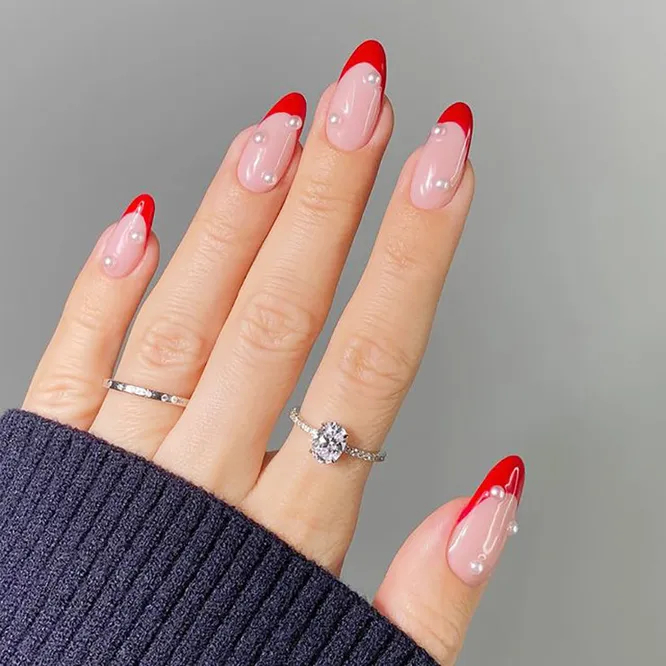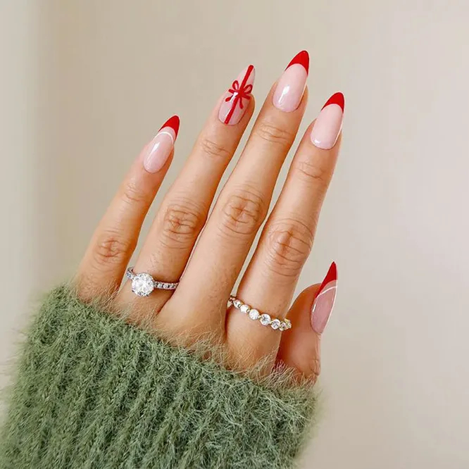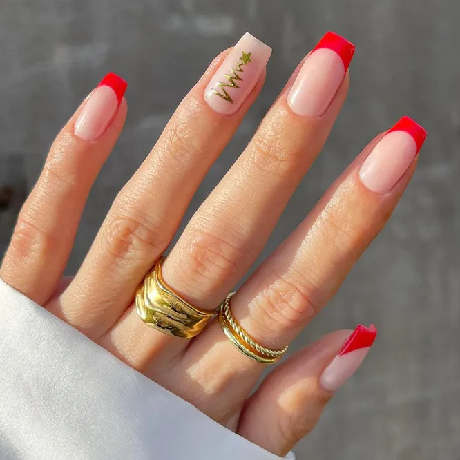 Для новорічного манікюру ви можете вибрати і незвичайний френч традиційного новорічного кольору – червоний! Фон краще зробити максимально нейтральним (молочний – ідеально підходить), а ось кінчики – яскравими.