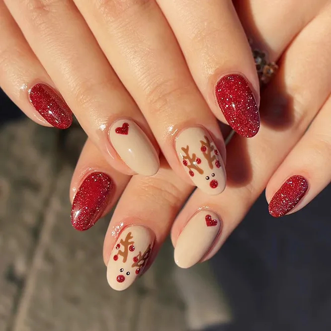 Вірні супутники Санта-Клауса та Діда Мороза – новорічні олені! Їхні милі мордочки також можуть стати основою для вашого святкового манікюру. Такий дизайн виглядає неймовірно мило!