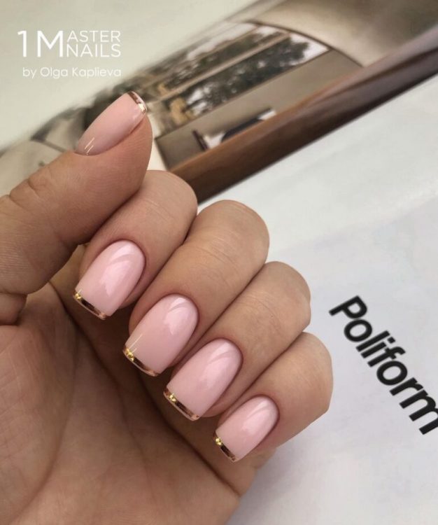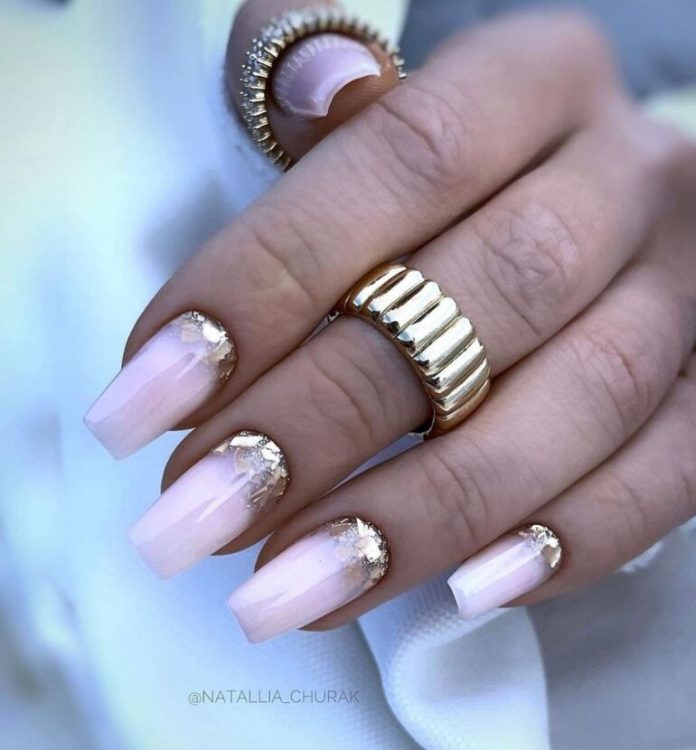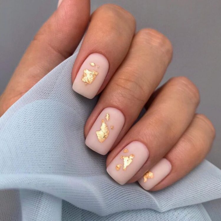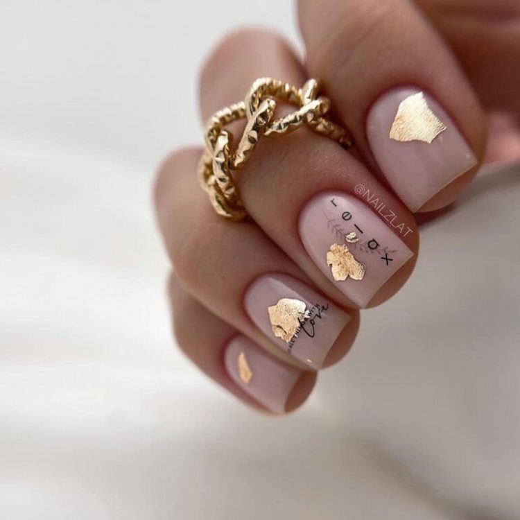Такий дизайн сподобається справжнім леді. Золотистий декор може бути реалізований у вигляді фольгованих смужок, блискучих страз та каміфубуками. Поєднання нюдового покриття та золота виглядає дуже дорого та ошатно.