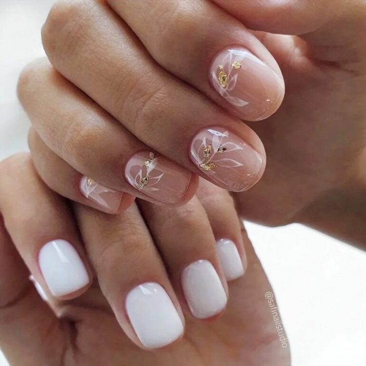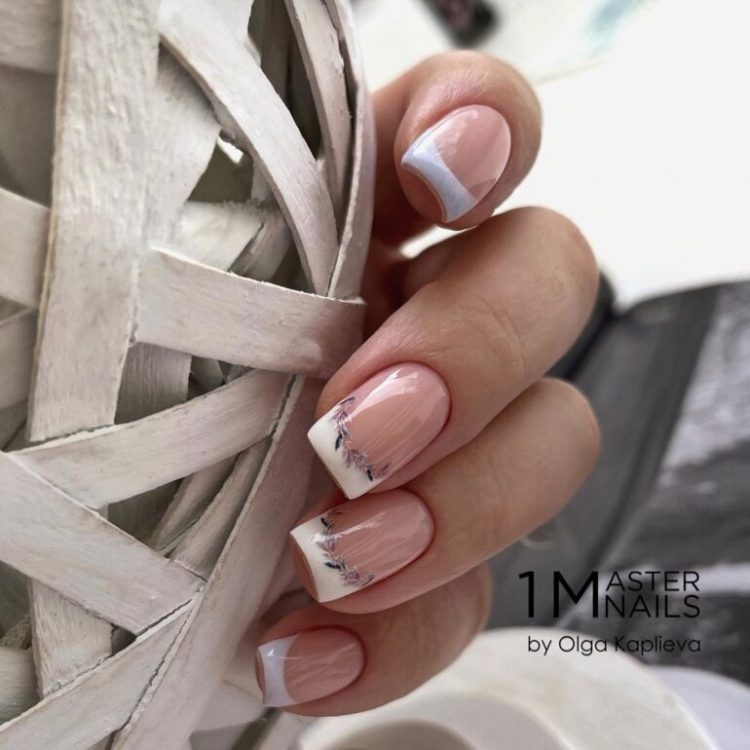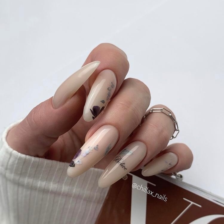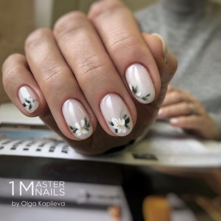 Шанувальникам простоти та природності варто придивитися до рослинних мотивів у нюдовому манікюрі. Гарно виглядають на нігтиках гілочки, квіточки та акварельні листочки, виконані у вигляді напівпрозорих принтів.