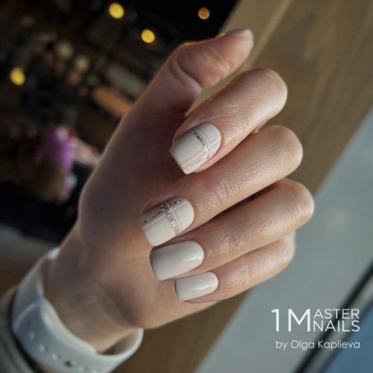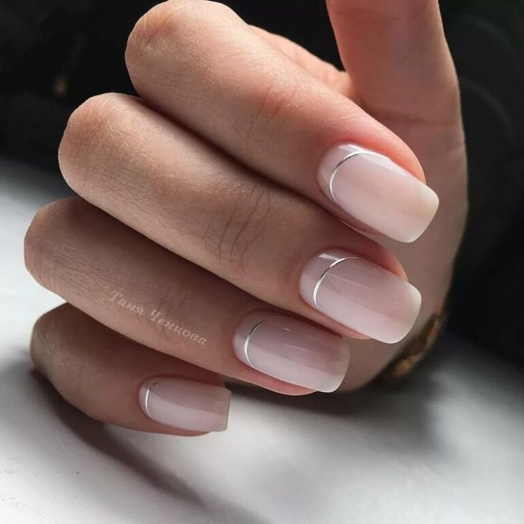 Таке рішення є дуже креативним та цікавим. Матовий манікюр гармонійно виглядає в тандемі із сріблястими смужками. На той час глянсовий – із золотистою стрічкою. Якщо додати трохи блискіток, то дизайн вийде дуже ошатним. Особливо якщо вибрати нюдовий манікюр на короткі нігті квадратної форми.
