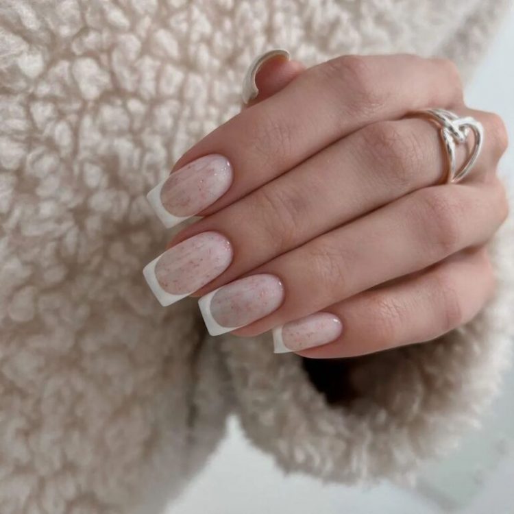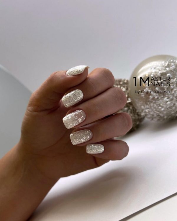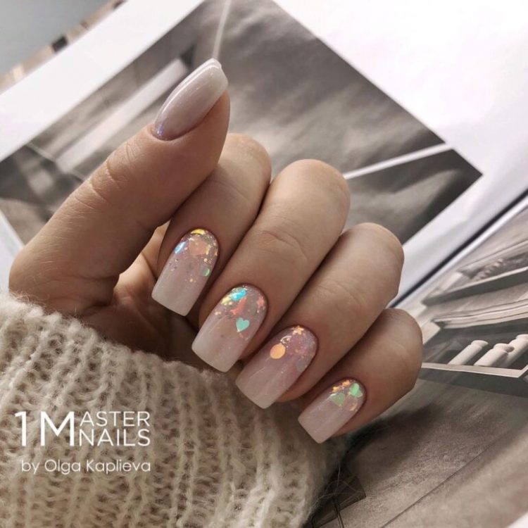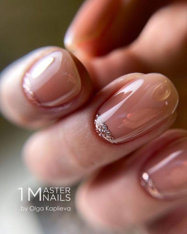 В якості основи в такому манікюрі використовується нюдове покриття. А для його доповнення наноситься глітер із градієнтної розтяжки. Це дозволяє надати нігтикам ніжного та інтригуючого вигляду.