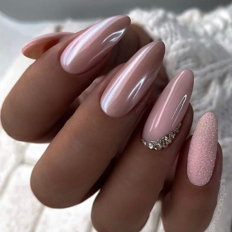 Втіливши блискучий нюдовий манікюр на довгі нігті 2022, можна піти на вечірку або світський захід. Глітерна розтяжка продемонструє бездоганний смак своєї володарки, яка віддала перевагу подібному дизайну.