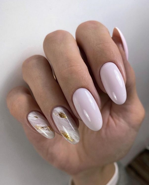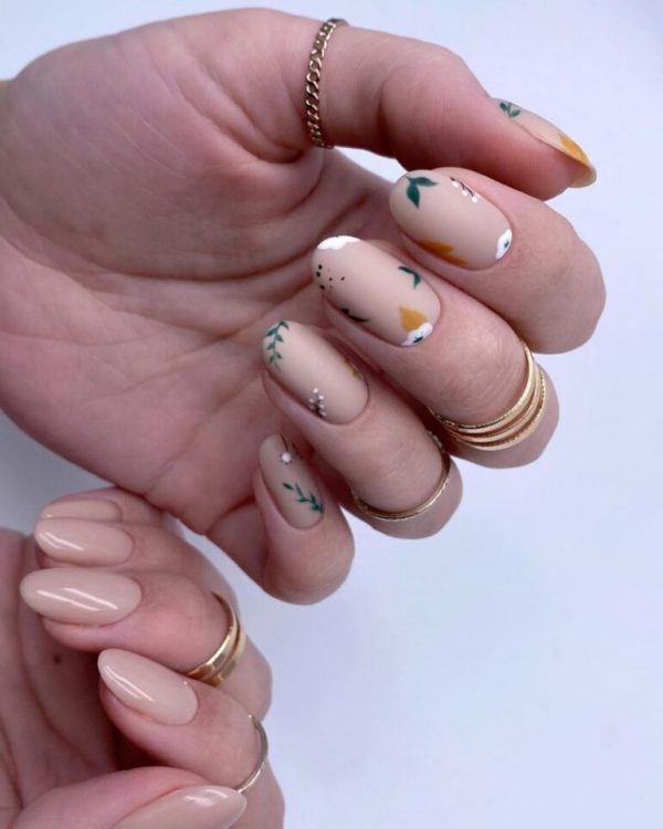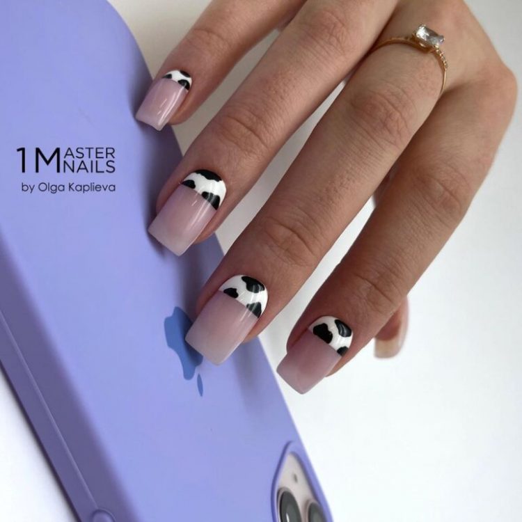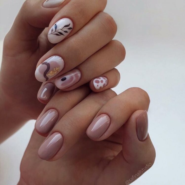 Не менш чудово буде виглядати цей дизайн у поєднанні з міні-гілочками у графічному стилі. Також на нігтях можна втілити яскраві композиції на ніжному тлі. Ще один актуальний нюдовий манікюр на короткі нігті овальної форми 2022 року – з принтом корови.