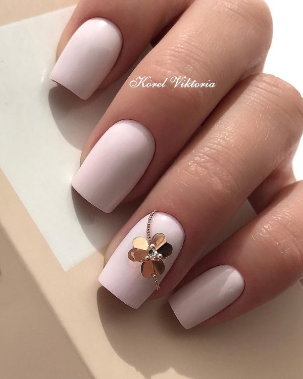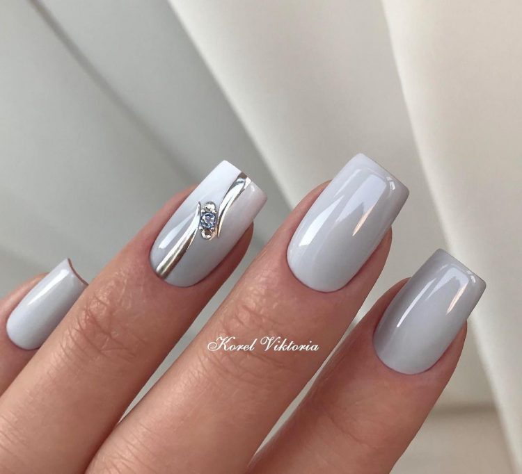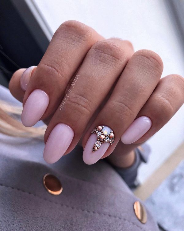 Якщо у вас не дуже строгий дрес-код, тоді можна додати до манікюру стрази. Важливо, щоб загальне тло було спокійним, бажано вибирати пастельні, нюдові чи білі відтінки лаку. Блискучих камінців теж не повинно бути багато, достатньо зробити акцент на одному нігті.