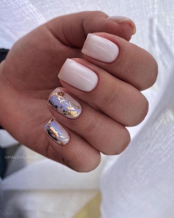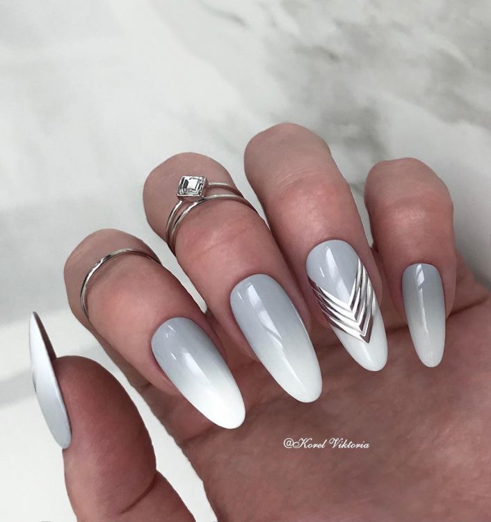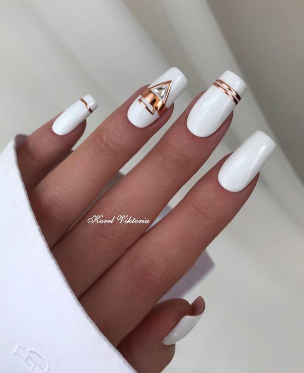Геометрія одночасно дозволяє розкрити свою фантазію та підібрати дизайн до офісного манікюру. У цьому стилі добре виглядають смужки всіх кольорів веселки, але для ділових жінок більше підходять золоті або срібні смужки на світлому фоні. Також можна вибирати і складніші геометричні форми, але головне в цій справі – не переборщити.