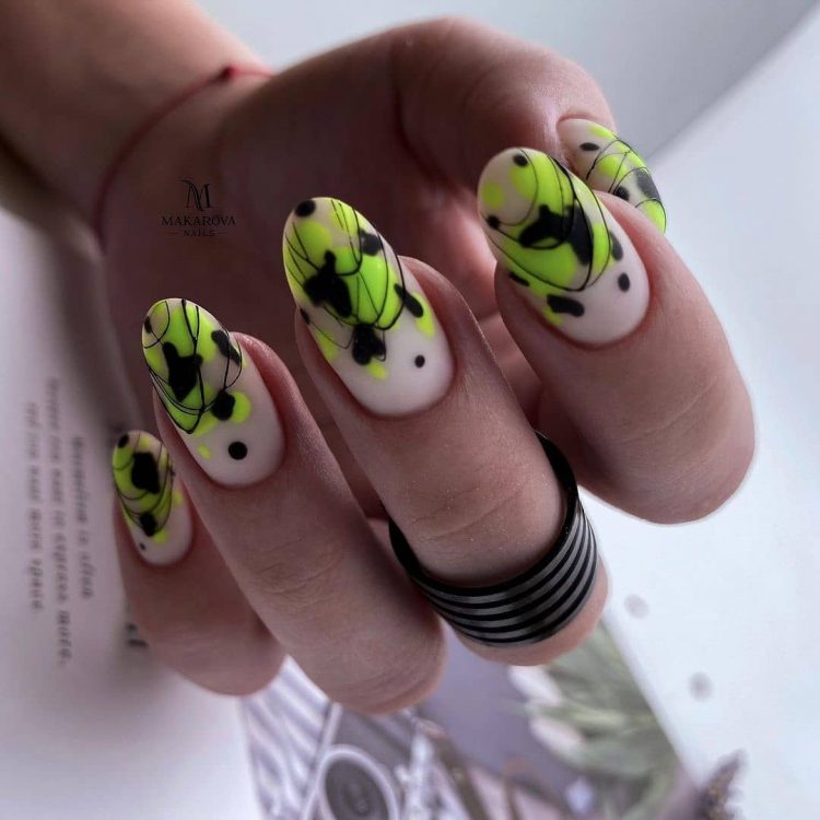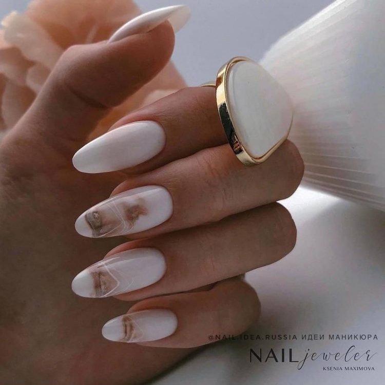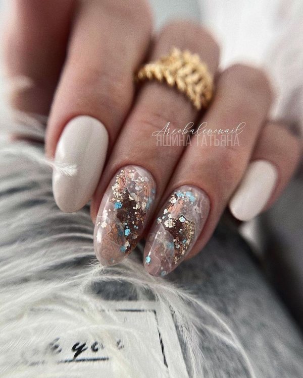 Цей тренд чудово виглядає на овальних нігтях. Бризки, що імітують перепелині яйця, найбільше підходять для нешироких нігтьових пластин. Крім естетичної привабливості, дизайн візуально подовжує пальці. Нейл-арт роблять студентки, офісні співробітниці та домогосподарки, і він їм усім підходить.
