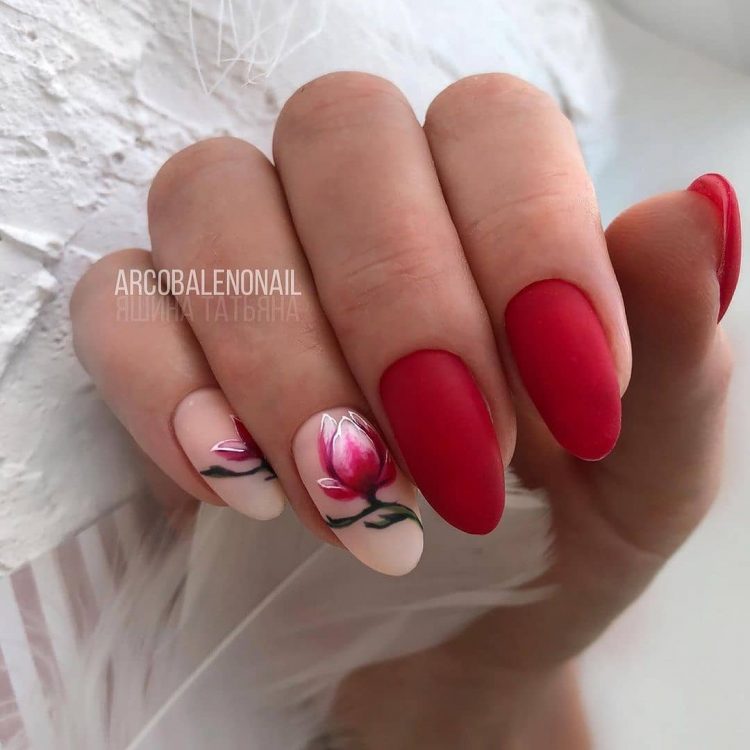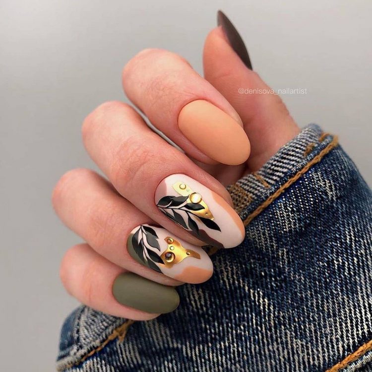 Стильний манікюр із листочками, доповненими квітами, вписується в імідж будь-якої модниці. Він вносить нотку легкості та освіжає образ. Малюнок можна намалювати за допомогою тонкого пензля або одразу купити в магазині готові наклейки, зручні трафарети.