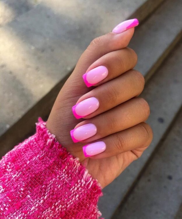 Французький манікюр у рожевих відтінках є класичним, але його можна обіграти по-різному, збільшуючи ступінь яскравості рожевого кольору.