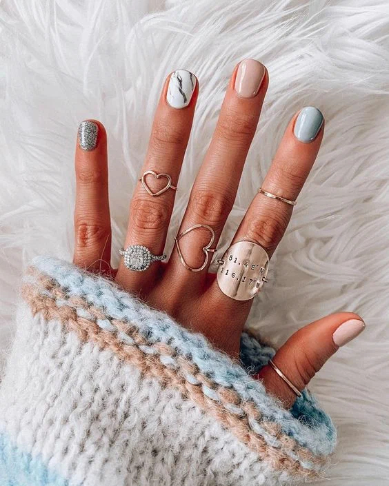 Наступний ефектний манікюр передбачає мармуровий дизайн, однотонне покриття, а також доволі багато блискіток. Завершеності цьому манікюру додає глянцевий фініш.